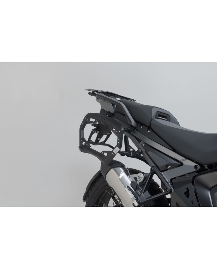 Le robuste valigie in alluminio TRAX ADV sono perfette per qualsiasi percorso: le impronte di design rafforzano la stabilità del materiale delle pareti in alluminio saldato dello spessore di 1,5 millimetri. Un coperchio completamente rimovibile con maniglie in alluminio anodizzato e chiusure rapide facilita il carico e lo scarico delle valigie da moto, mentre il bordo laterale smussato garantisce un'elevata altezza da terra in curva. Con questa soluzione completa hai tutti i componenti necessari per partire subito per un lungo viaggio con TRAX: due valigie laterali TRAX ADV impermeabili, due portapacchi laterali rimovibili SW-MOTECH, kit adattatori, set di serrature, limitatori di apertura e dispositivo antifurto a un prezzo complessivo interessante. I supporti specifici per il modello e le dimensioni delle valigie sono perfettamente adattati alla geometria posteriore e al sistema di scarico della moto.