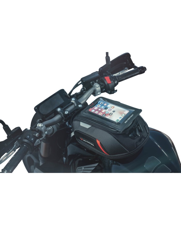 \nLa custodia impermeabile Drybag per smartphone è compatibile con tutte le borse serbatoio PRO. L'involucro in plastica del supporto con ampia finestra e dimensioni interne di 170 x 100 mm è adatto a quasi tutti gli smartphone di dimensioni fino a 6,7 pollici. Lo smartphone si fissa alla borsa serbatoio tramite il sistema di fissaggio T-Lock. È possibile scegliere liberamente la posizione del supporto T-Lock sul sistema di fissaggio MOLLE. Le informazioni dettagliate su come fissare il T-Lock al sistema di fissaggio MOLLE sono riportate nelle istruzioni per l'uso. Una volta montato il supporto T-Lock, è possibile staccare la Drybag per smartphone, se necessario, ruotandola di un quarto di giro. Con un solo gesto, il dispositivo viene nuovamente smontato.