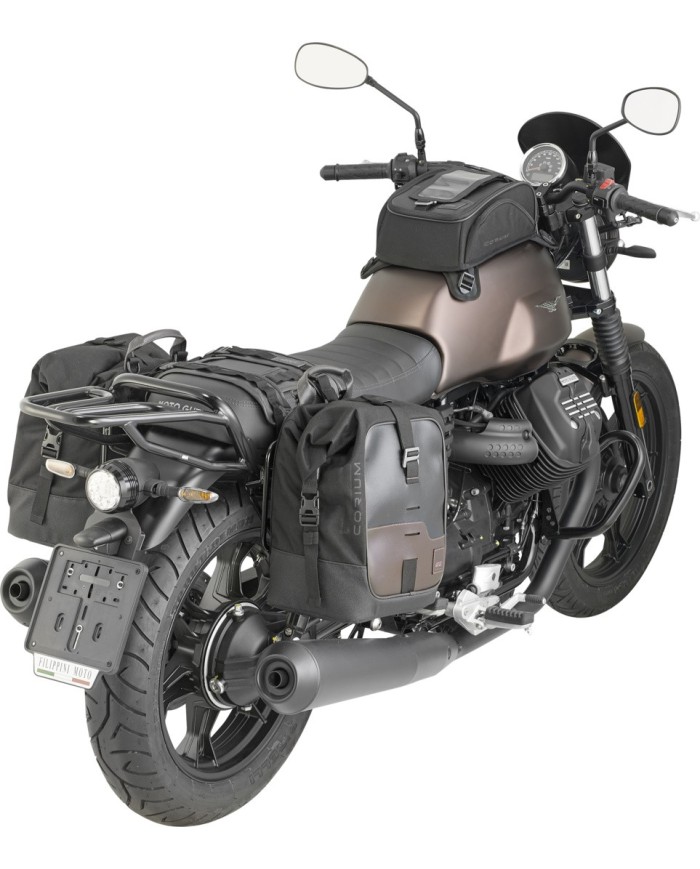 - Grazie alla disposizione delle cinghie, è possibile regolare l'altezza dei punti di fissaggio delle borse, in modo che possano essere montate anche su moto con scarichi alti.