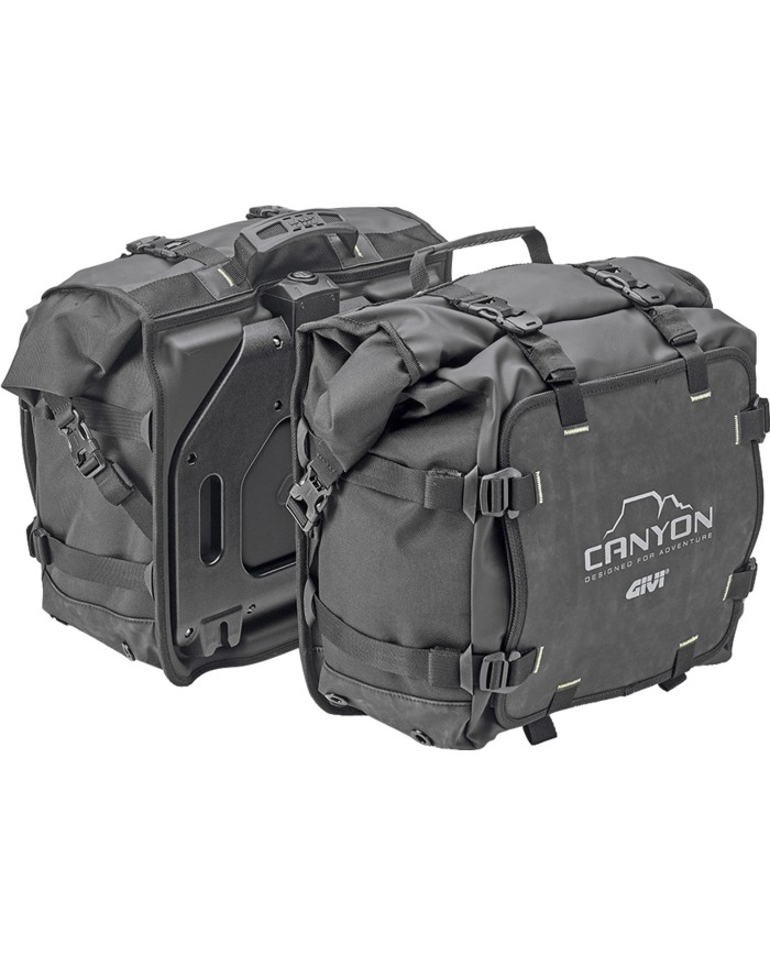 Progettate dalGIVIe per moto fuoristrada, sono dotate del sistema di aggancio/sgancio MONOKEY®, compatibile con i supporti tubolari per valigie laterali PL_ _ _, PLR_ _ _, PLO_ _ _MK, PLOR_ _ _MK, PLO_ _ _N (+OFMK), PLOR_ _ _N (+OFMK). Dotate di chiave di sicurezza, che può essere unificata con il bauletto e la cassetta degli attrezzi, utilizzando i kit SL102-SL103-SL105. Le borse laterali GRT720 Canyon, grazie alle fibbie laterali di cui sono dotate, consentono di modulare la configurazione dei bagagli in base alle esigenze di carico, sia che si tratti di brevi tragitti giornalieri in moto o di viaggi più lunghi e impegnativi, ad esempio con l'aggiunta delle GRT722 come carico laterale supplementare, resistente alle forti piogge e alle condizioni estreme.