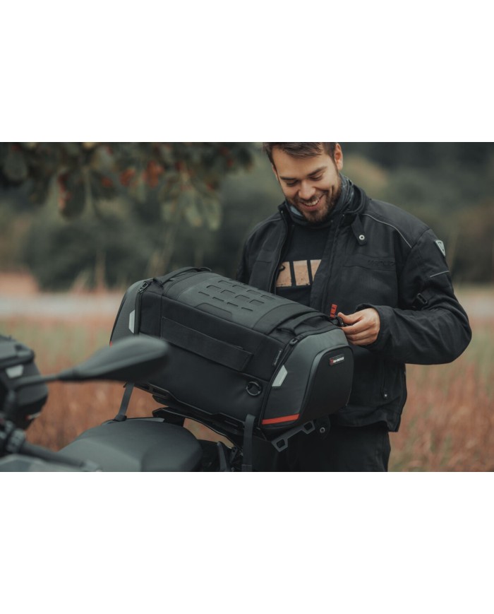 La robusta PRO Rackpack è stata sviluppata appositamente per l'uso sui portapacchi. In combinazione con la tracolla, è una pratica borsa da viaggio. Abbinandola al ripiano di espansione del portapacchi, può essere facilmente fissata allo STREET-RACK o all'ADVENTURE-RACK, nonché ai portapacchi standard, alle selle passeggero o a un sissy bar. Le estensioni su entrambi i lati della borsa da sella consentono di aumentare la capacità da 32 a 42 litri. È possibile riporre in modo sicuro piccoli bagagli nelle due tasche laterali con rete interna. La parte inferiore è realizzata in materiale antiscivolo e la parte superiore della borsa da sella PRO Rearbag offre una tenuta sicura delle tasche accessorie sull'attacco MOLLE cucito. La borsa da sella della serie PRO è realizzata in nylon balistico 1680D altamente resistente, originariamente progettato per uso militare. Inoltre, si distingue per le finiture di qualità e le caratteristiche ben studiate: inserti riflettenti migliorano la visibilità, robusti ganci di fissaggio consentono di agganciare le borse in modo semplice e veloce alla parte posteriore e un sistema MOLLE sulla parte superiore consente di fissare le tasche accessorie. I ganci di fissaggio brevettati consentono un fissaggio flessibile delle borse da sella PRO. È sufficiente un solo gesto per fissare e tendere la cinghia. Per rimuovere la borsa, la cinghia viene allentata con un solo gesto e rimossa dall'anello di fissaggio tirando il cordino. È possibile bloccare la lunghezza in eccesso della cinghia grazie a un sistema Velcro®. La borsa può essere utilizzata su diverse moto adattando la lunghezza della cinghia.