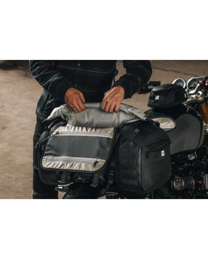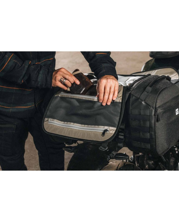 \nLa borsa posteriore, stabile nella forma, si adatta perfettamente alla moto, indipendentemente dal carico. Gli attacchi MOLLE consentono di fissare tasche aggiuntive, mentre le tasche interne impermeabili e luminose proteggono il contenuto e possono essere fissate in modo sicuro grazie alle chiusure in velcro laterali.