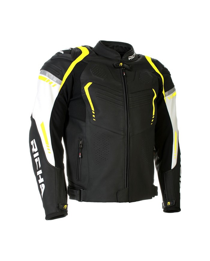 La giacca Misano incarna tutto ciò che i motociclisti apprezzano in una giacca sportiva in pelle: combina il look race e naked con le tendenze attuali e il suo taglio sportivo garantisce un comfort ottimale senza trascurare la sicurezza. Realizzata in pelle Nappa di alta qualità combinata con inserti elasticizzati resistenti. Le perforazioni di ventilazione e l'esclusivo sistema di ventilazione Richa (A.R.V.S) assicurano un clima piacevole. Materiali: pelle di vacchetta nappa con Cordura elasticizzata su braccia e spalle; neoprene sul collo per un comfort superiore. Fodera/Membrana: fodera interna in poliestere rimovibile; fodera in rete in poliestere meshVentilazione: le perforazioni e il sistema di ventilazione A.R.V.S. (advanced Richa venting system) con cerniere di ventilazione garantiscono un clima ideale in tutte le condizioni atmosfericheRegolazione: regolazioni sui fianchiCombinazione: cerniera di collegamentoProtezioni: protezioni D3O - omologate CE - su schiena, spalle e gomiti