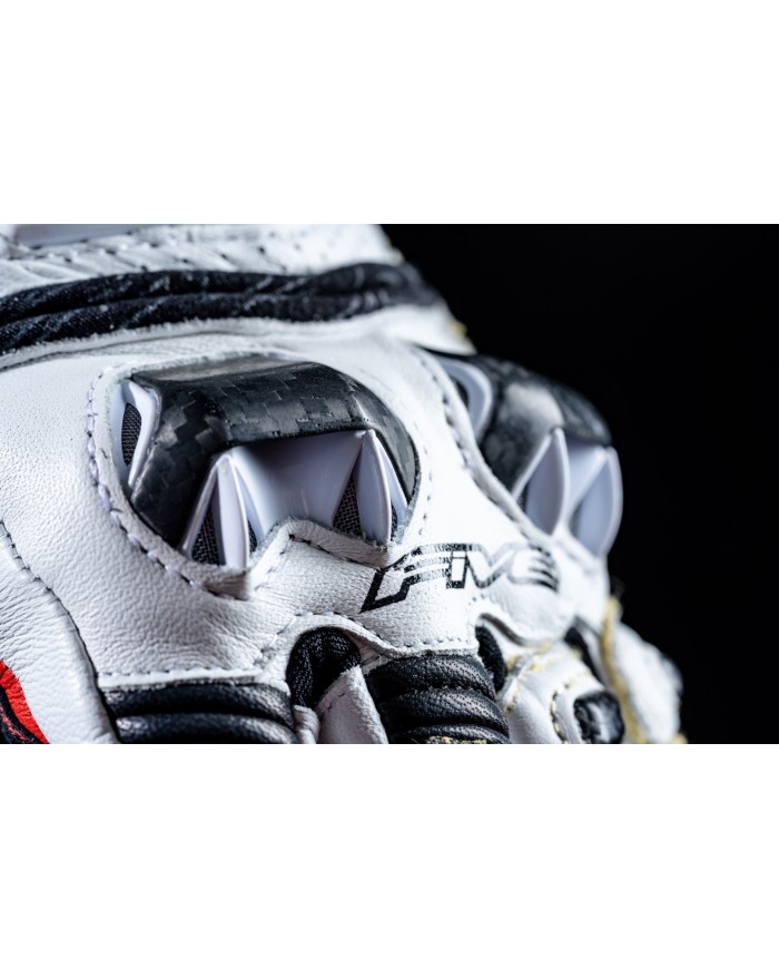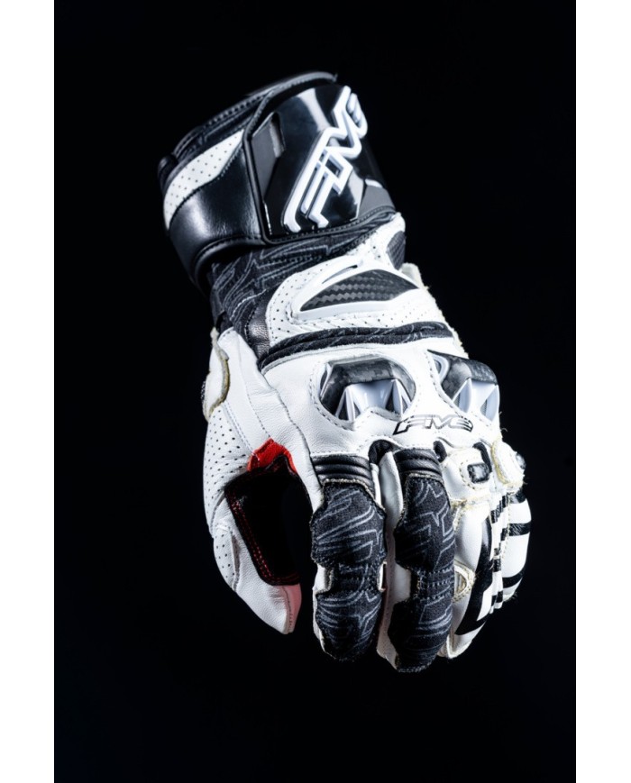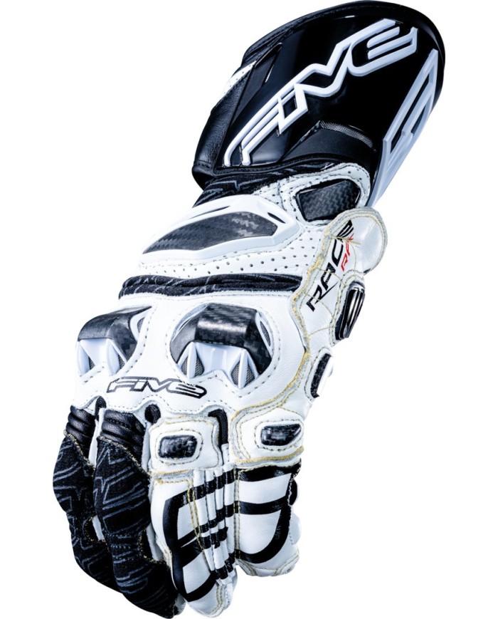 Il più avanzato dei FIVE ADVANCED GLOVES?. Progettato per garantire prestazioni elevate, il modello RFX Race offre il massimo livello di sicurezza attualmente disponibile, grazie al suo triplo guscio protettivo in carbonio composito termosetico. Questo materiale, solitamente utilizzato nell'industria aeronautica e nella Formula 1, offre un'eccezionale resistenza all'abrasione. Ciò rende questo guanto più efficace di un guanto normale in situazioni estreme di lunghe scivolate in cui la mano del pilota può rimanere incastrata tra la pista e la moto. La protezione è ottimizzata dall'uso di pelle pieno fiore, numerosi rinforzi in carbonio tradizionale e una fodera interna in Kevlar®. Il palmo è dotato di un rinforzo in pelle inglese Digital Pittards® per una presa ottimale in condizioni di umidità. La linguetta di regolazione in velcro è nascosta sotto un pannello di protezione in pelle per ridurre il rischio di strappi in caso di caduta. La precisione di guida e il comfort sono stati oggetto della massima attenzione. RFX Race: il guanto sviluppato e utilizzato dai piloti ufficiali FIVE nei Campionati Mondiali MotoGP, SBK ed Endurance.