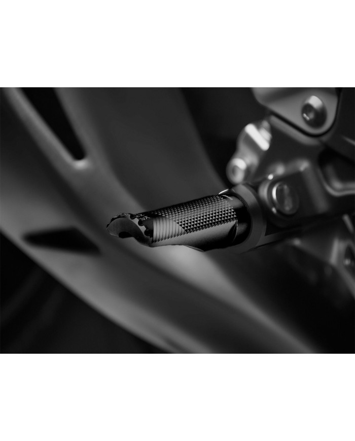 Questa lavorazione di alta precisione genera un'aderenza particolarmente buona, necessaria per una guida sportiva. La parte esterna è caratterizzata da una corona dentata che riduce la possibilità di perdita di trazione laterale, soprattutto quando il pilota esercita una pressione maggiore sulla parte esterna del poggiapiedi. Disponibile in diversi colori, la superficie è sigillata con un processo di anodizzazione che garantisce una maggiore durata.