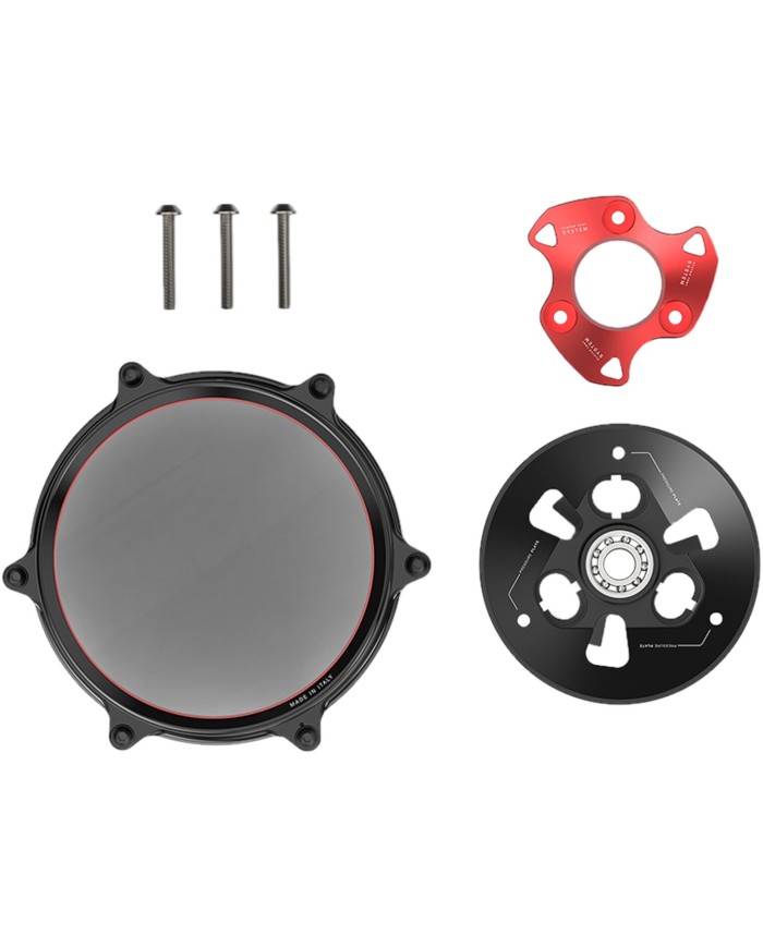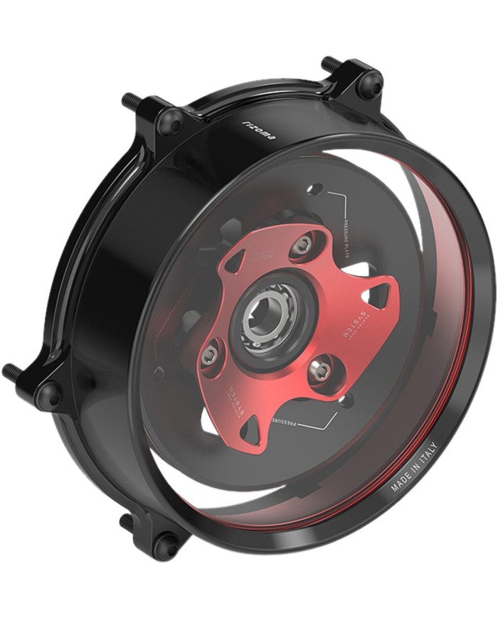 I componenti interni sono stati sviluppati per garantire l'eccellenza estetica e tecnica. Il sistema di ventilazione della frizione, composto da una piastra di pressione in alluminio leggero e da un anello di pressione, è appositamente progettato per ottimizzare al massimo il circuito dell'olio della frizione all'interno del coperchio. Inoltre, Rizoma ha selezionato viti in titanio per il fissaggio dei componenti interni al fine di ridurre al minimo le masse in movimento e aumentare la resistenza meccanica. Per una migliore esperienza di acquisto e installazione, il coperchio della frizione è venduto in kit, contenente tutti i componenti necessari per la sostituzione completa dei componenti OEM, compreso un cuscinetto a sfere della piastra di pressione preassemblato, ed è stato progettato per una rapida installazione plug-and-play.