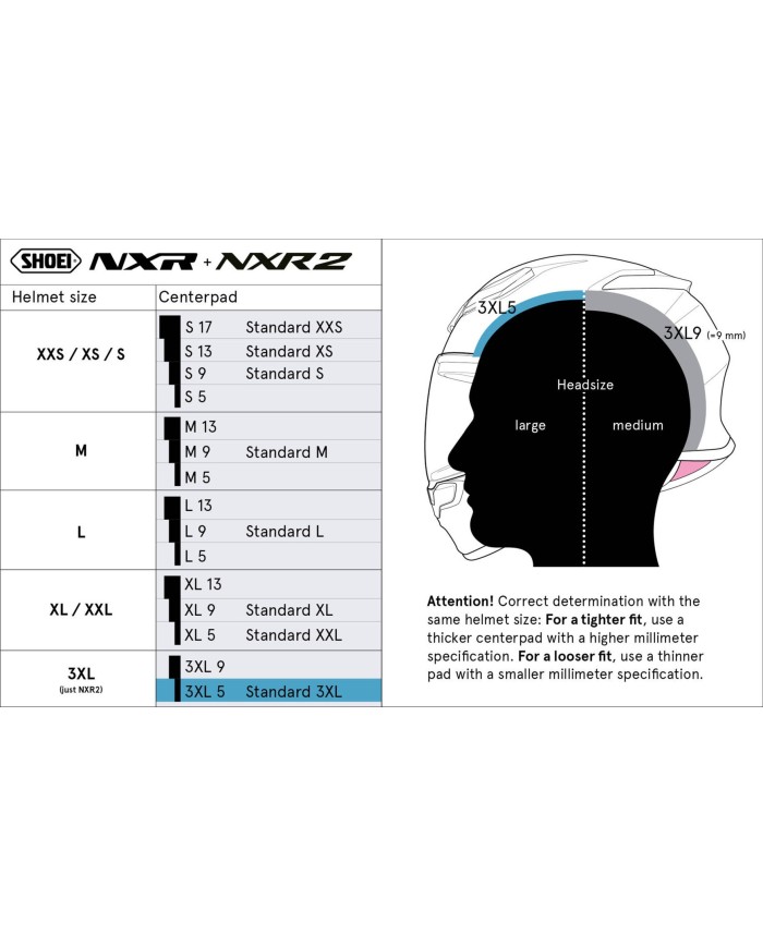 È possibile utilizzare imbottiture di diverse dimensioni per sostituire quella originale o per personalizzare il casco nella parte superiore della testa. I cuscinetti di un modello di casco sono intercambiabili in base alla loro destinazione d'uso, ad esempio S9 - S13 - S17 . S9 indica un cuscinetto sottile, S17 un cuscinetto spesso, come mostrato nello schema sottostante.