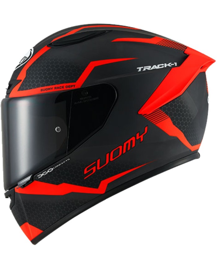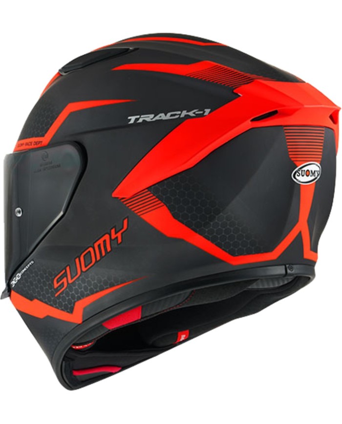 Il TRACK-1 è il casco integrale di nuova generazione delSuomy, realizzato in composito TRICARBOCO (Kevlar/Carbonio/Fibra di vetro). Le sue forme dinamiche e orientate alle prestazioni sono state progettate in galleria del vento per offrire un perfetto equilibrio tra uso su strada e pista.