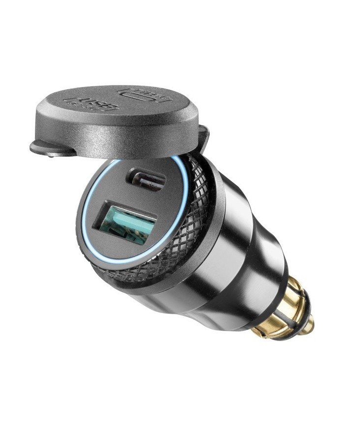 L'adattatore DIN è dotato di due porte USB in alluminio, una porta di tipo C e una porta di tipo A, e consente di ricaricare contemporaneamente due dispositivi elettronici. Grazie alla porta di tipo C, la ricarica dei dispositivi è rapida ed efficiente, anche durante il viaggio. Molto piccolo e compatto, è dotato di un cappuccio protettivo ed è pratico e senza fili. L'involucro è interamente in alluminio per resistere alle condizioni atmosferiche.