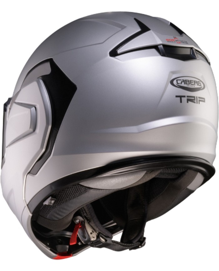 TRIP è il primo casco FLIP-BACK di Caberg con mentoniera reversibile grazie a un pernounique.Contrairemento rispetto ai caschi modulari tradizionali, la mentoniera, una volta aperta, non rimane sopra la calotta, ma compie una rotazione completa di 180 gradi verso la parte posteriore del casco. È omologato ECE 22.06 P e J, il che significa che può essere utilizzato sia come casco integrale con mentoniera chiusa che come jet con mentoniera aperta, soddisfacendo le esigenze dei motociclisti che desiderano fare turismo con un casco molto versatile.