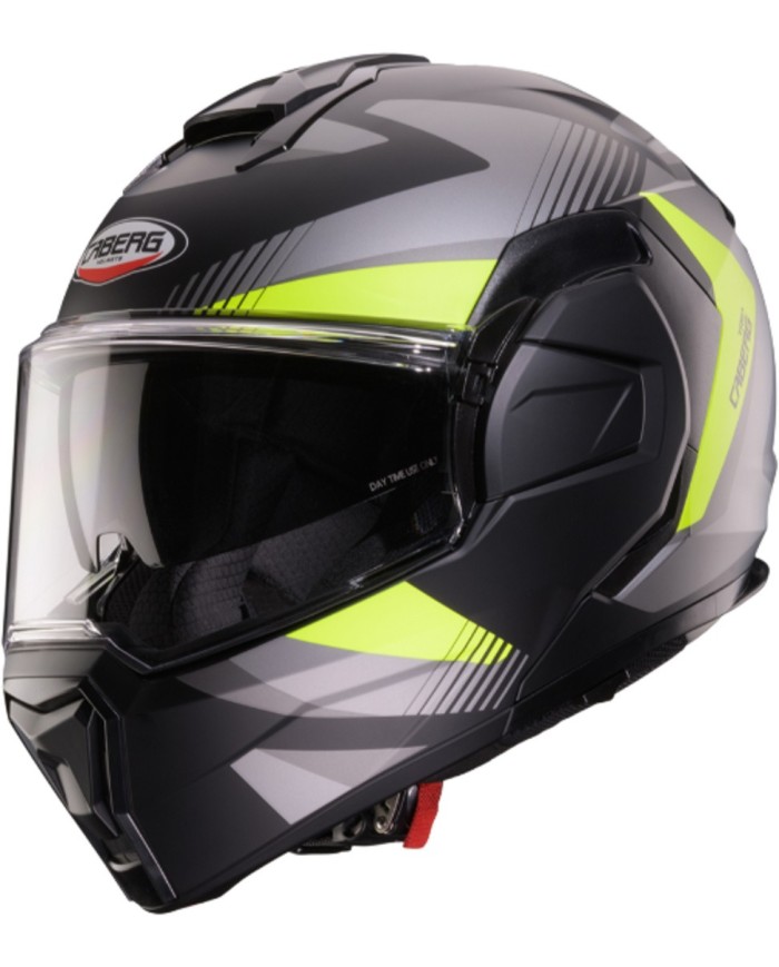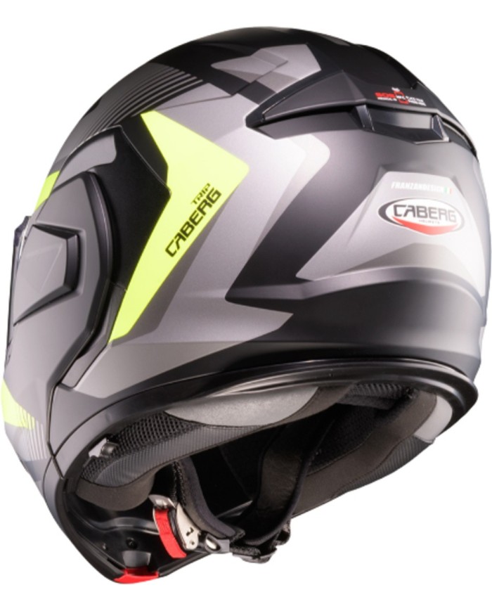 TRIP è il primo casco FLIP-BACK di Caberg con mentoniera reversibile grazie a un pernounique.Contrairemento rispetto ai caschi modulari tradizionali, la mentoniera, una volta aperta, non rimane sopra la calotta, ma compie una rotazione completa di 180 gradi verso la parte posteriore del casco. È omologato ECE 22.06 P e J, il che significa che può essere utilizzato sia come casco integrale con mentoniera chiusa che come jet con mentoniera aperta, soddisfacendo le esigenze dei motociclisti che desiderano fare turismo con un casco molto versatile.