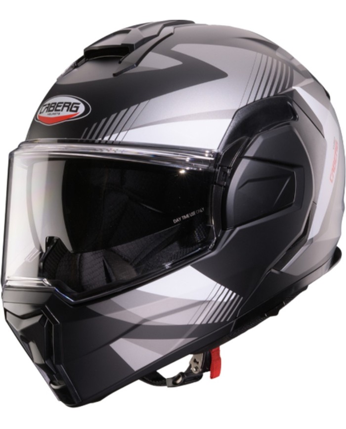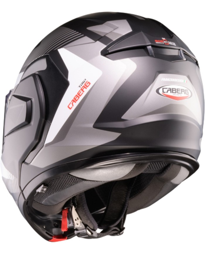 TRIP è il primo casco FLIP-BACK di Caberg con mentoniera reversibile grazie a un pernounique.Contrairemento rispetto ai caschi modulari tradizionali, la mentoniera, una volta aperta, non rimane sopra la calotta, ma compie una rotazione completa di 180 gradi verso la parte posteriore del casco. È omologato ECE 22.06 P e J, il che significa che può essere utilizzato sia come casco integrale con mentoniera chiusa che come jet con mentoniera aperta, soddisfacendo le esigenze dei motociclisti che desiderano fare turismo con un casco molto versatile.