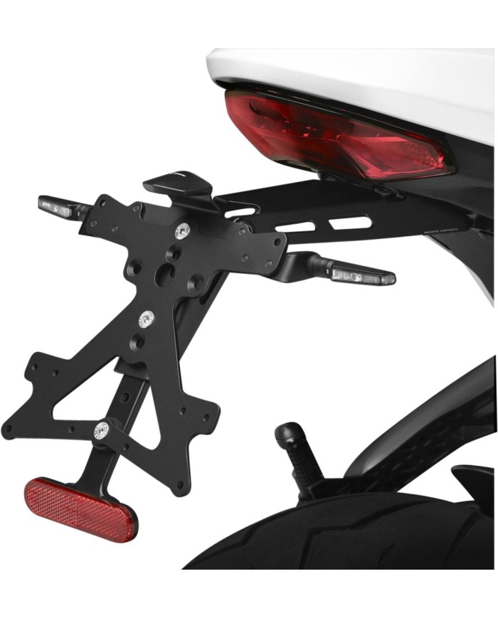 Il supporto per targa Fox in alluminio è progettato appositamente per ogni modello di moto. Ciò gli consente non solo di adattarsi perfettamente alle linee della moto, ma anche di distinguersi per la sua installazione semplice e veloce. Ogni kit contiene tutti i componenti necessari per il montaggio, senza necessità di modificare i componenti OEM. Massima funzionalità in uno spazio ridotto e rispetto delle norme di omologazione. I kit Fox comprendono un'illuminazione della targa a LED SMD, un riflettore e adattatori per indicatori di direzioneRizoma, sono regolabili e dotati di un dispositivo di bloccaggio per fissare la corretta inclinazione.