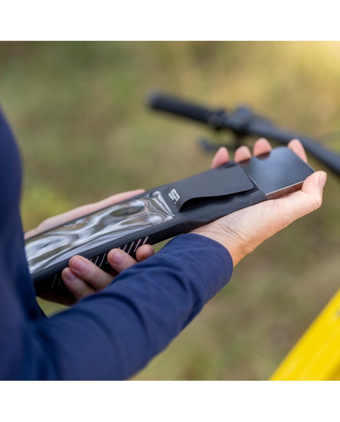 Basta inserire lo smartphone nella custodia, arrotolare l'apertura e fissarla con il nastro in velcro. La fodera in pile antigraffio e il telaio in EVA adesivo consentono di trovare la posizione perfetta per il cellulare.