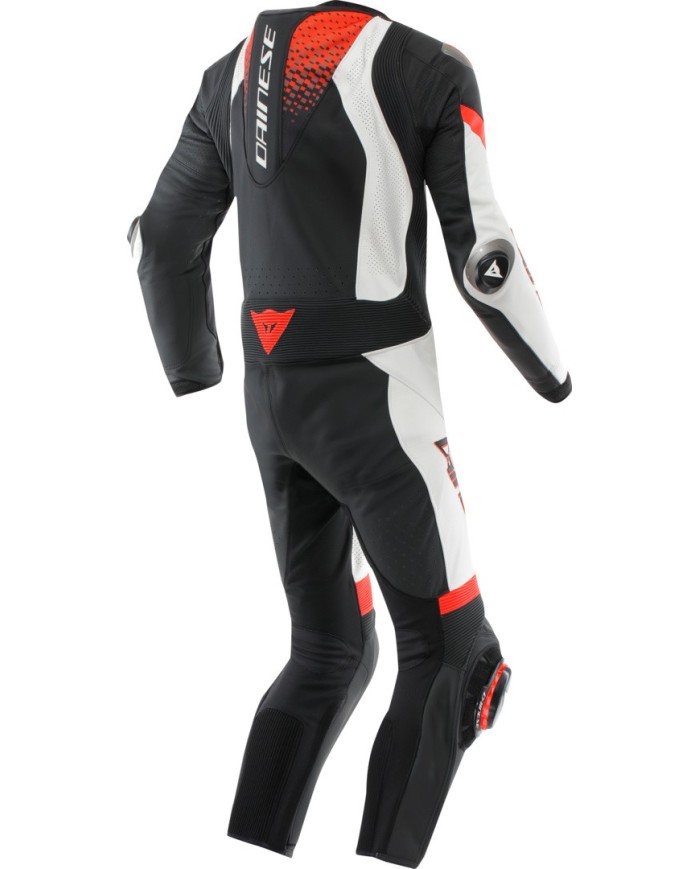 Tuta monopezzo in pelle bovina Tutu traforata, con placche in alluminio sulle spalle e una gobba aerodinamica per ospitare la sacca idrica del kit di idratazione. L'icona Dainese delle corse.